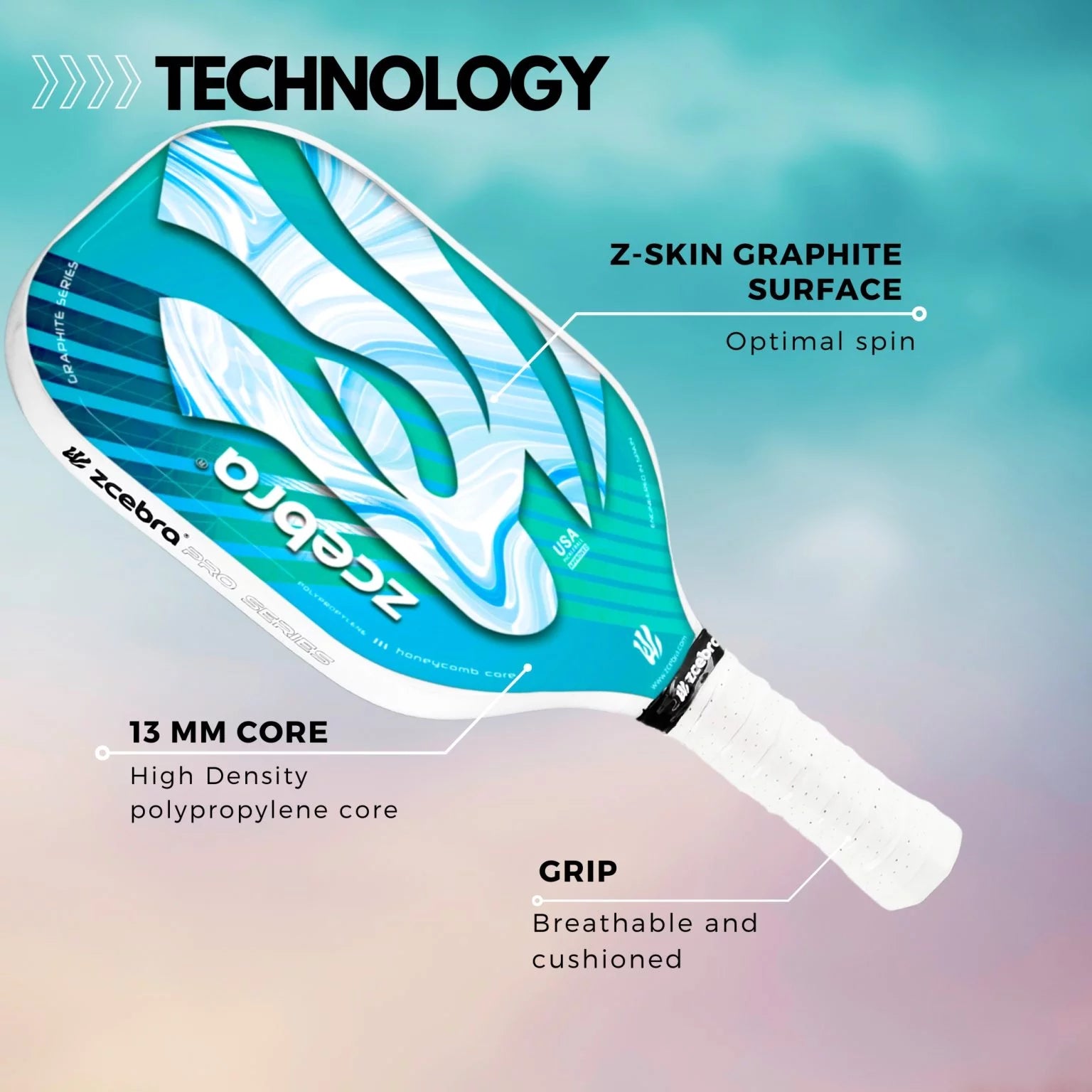 Its 13 mm thick core is made of high-density honeycomb polymer and Polypropylene. The Zcebra Graphite series has a standard shape, achieving a perfect proportion between width and length. The handle is medium in length, non-slip, comfortable, and padded.