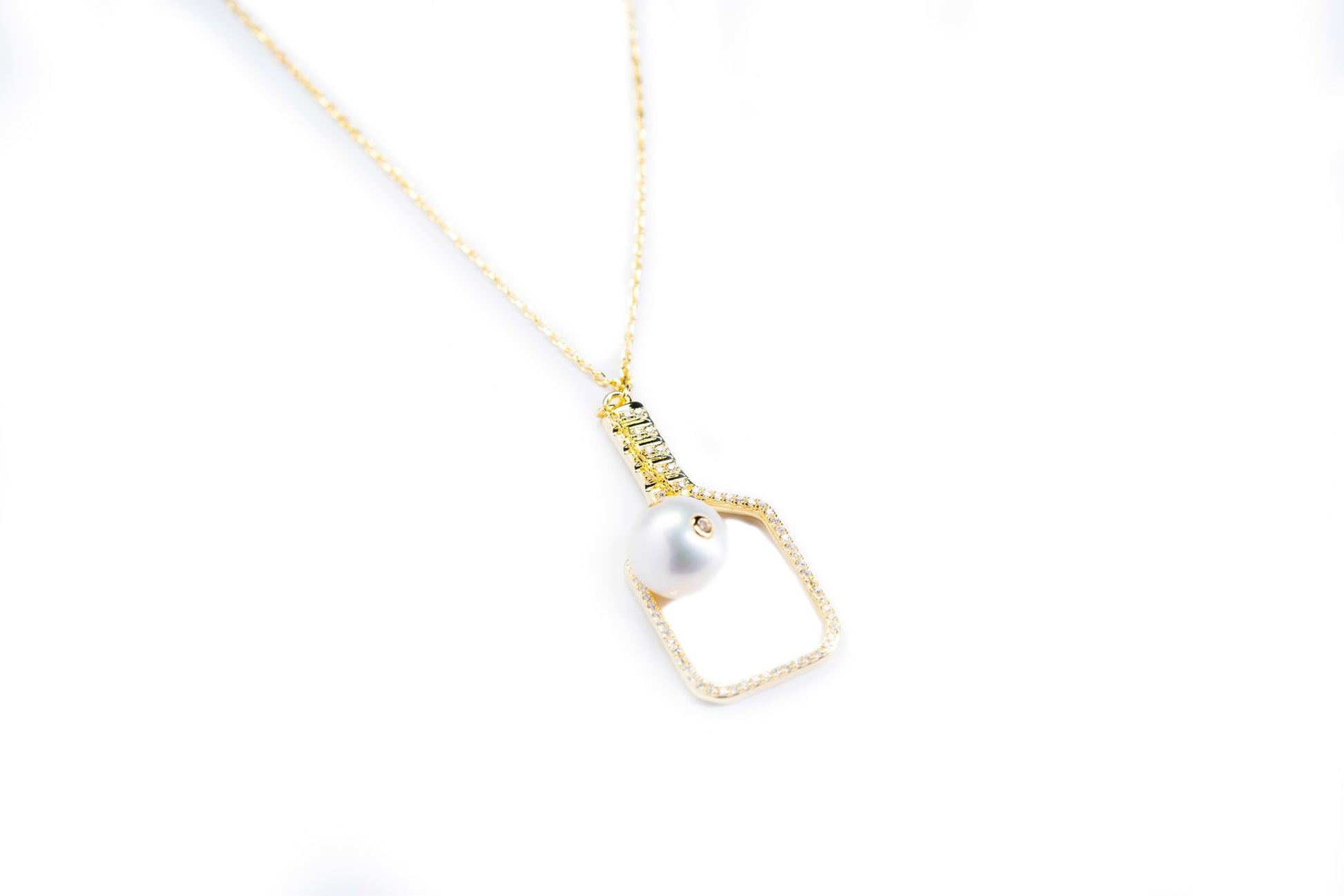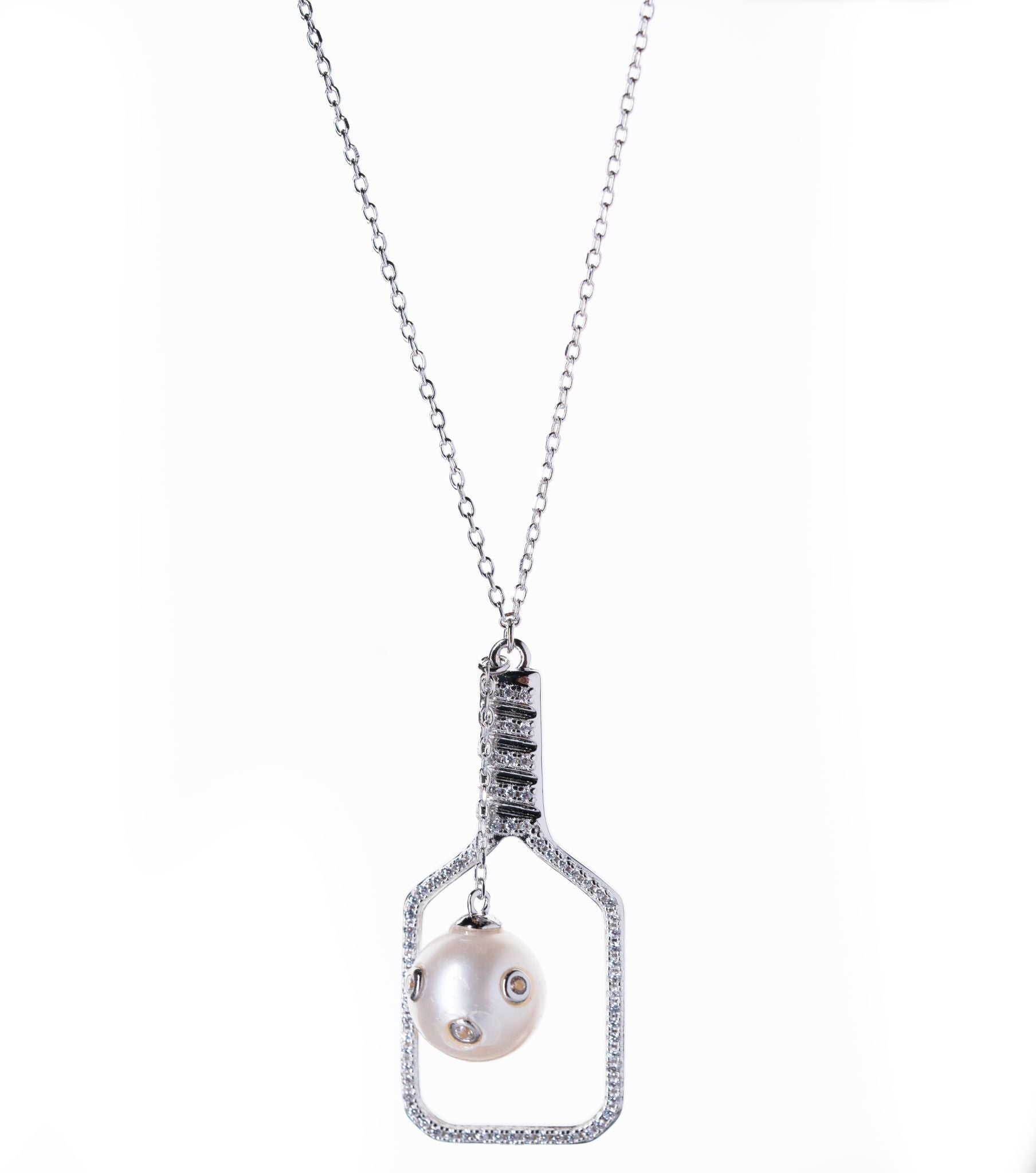 Paddle and freshwater pearl pendant set with cubic zirconia. Chain adjustable at 16" and 18"